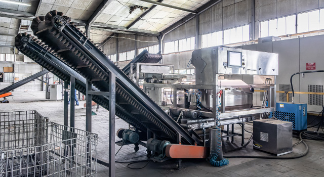 多数のナゲット機により被覆電線を高い効率でリサイクル処理を行う和歌山支店。被覆電線を破砕し、乾式ナゲット機と湿式ナゲット機に高純度の銅を取り出しリサイクル原料へと転換しています。